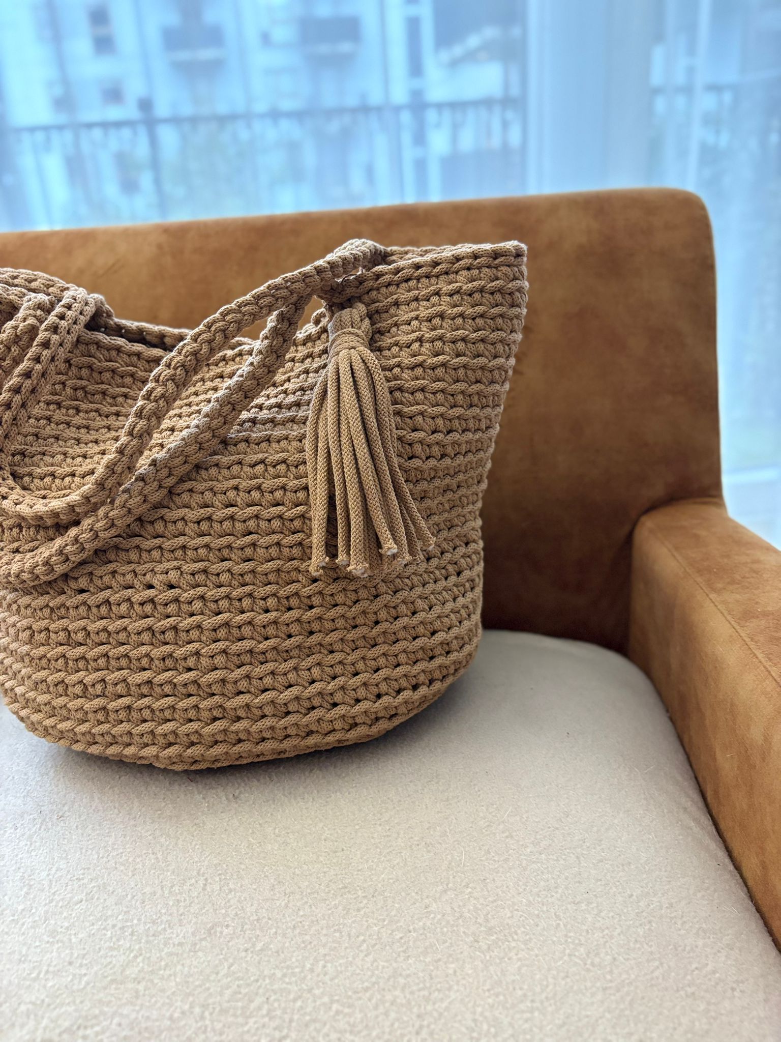 Discover this season's must-have accessory! A fashionable, spacious shopper bag, lovingly handmade from high-quality rope. The stylish silhouette, comfortable double handles, and chic decorative tassel make it a true statement piece. Each bag is a true handcrafted piece, crocheted with meticulous attention to every detail.