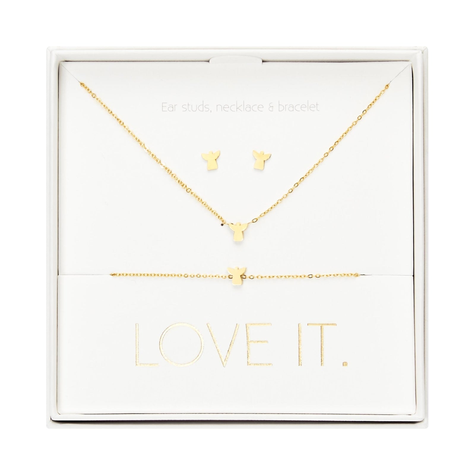 A high-quality gift set from the Love it. collection, consisting of a bracelet, necklace, and stud earrings. Beautifully packaged in an elegant cardboard gift box with a window and a glossy hot foil stamp.