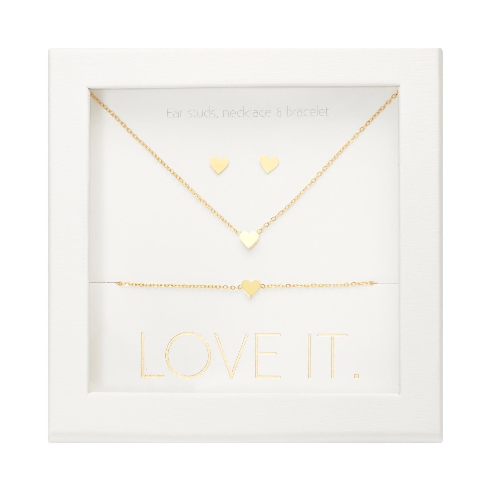 A high-quality gift set from the Love it. collection, consisting of a bracelet, necklace, and stud earrings. Beautifully packaged in an elegant cardboard gift box with a window and a glossy hot foil stamp.