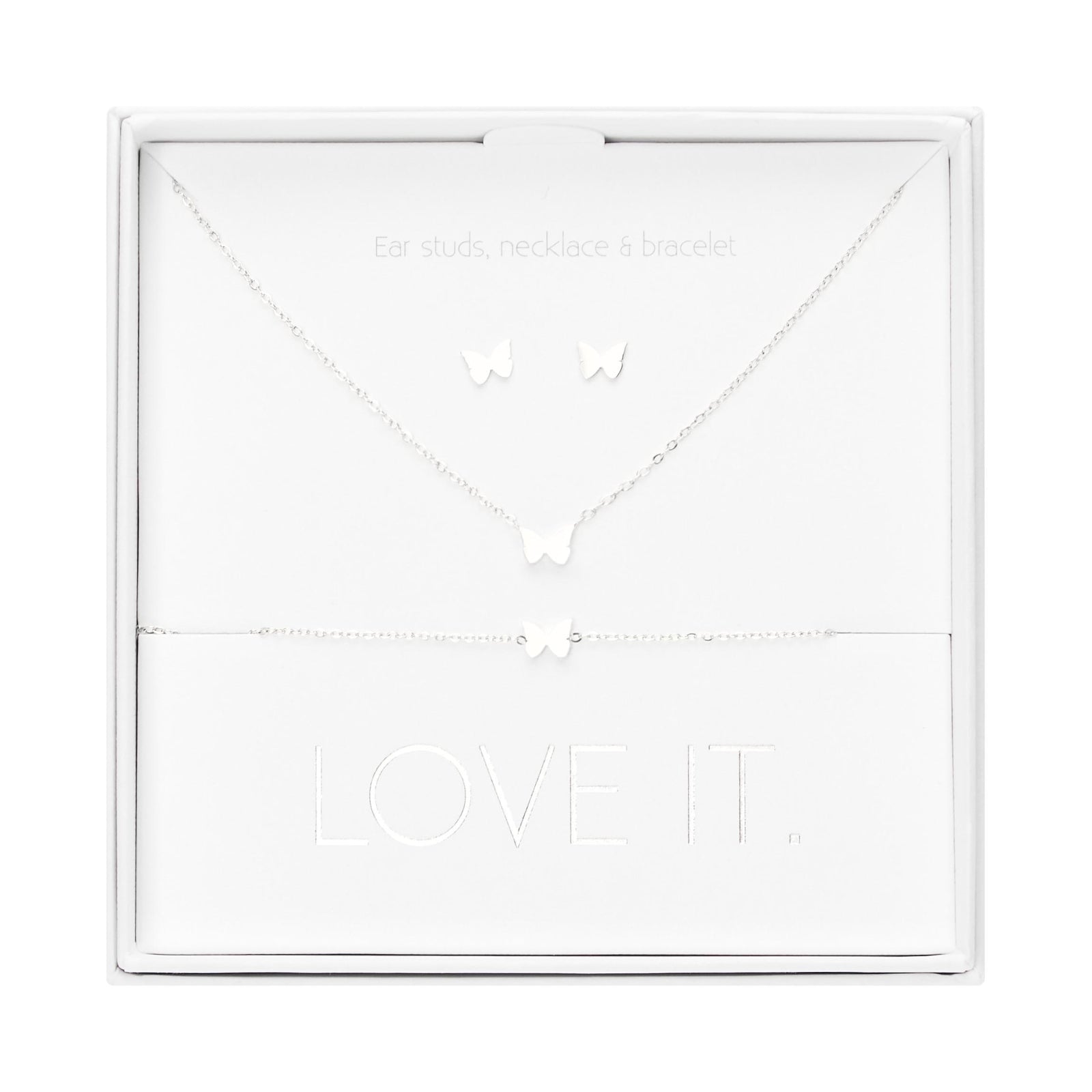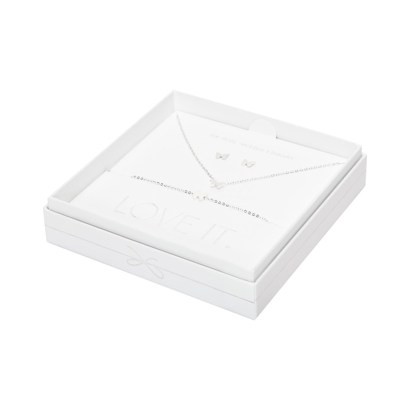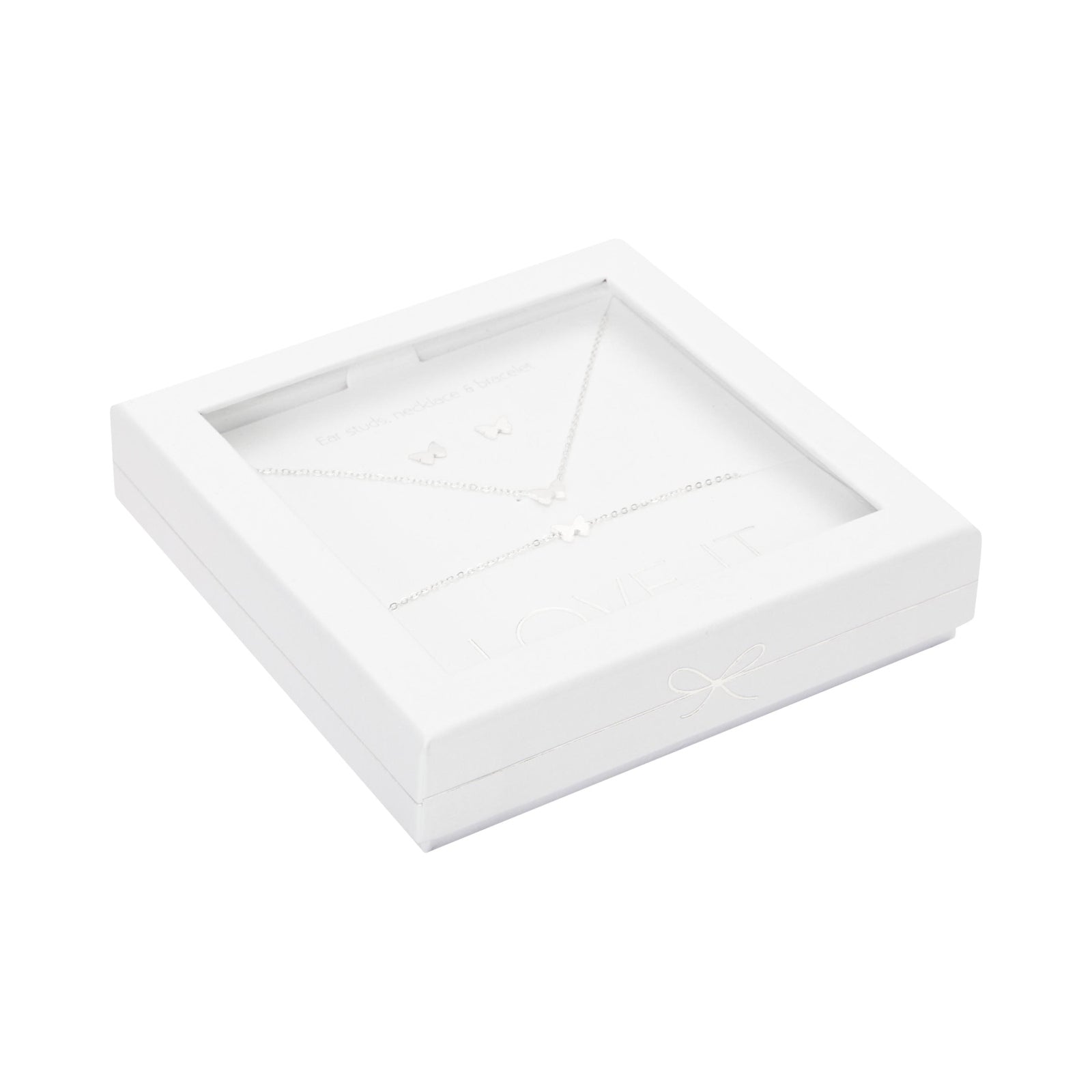 A high-quality gift set from the Love it. collection, consisting of a bracelet, necklace, and stud earrings. Beautifully packaged in an elegant cardboard gift box with a window and a glossy hot foil stamp.