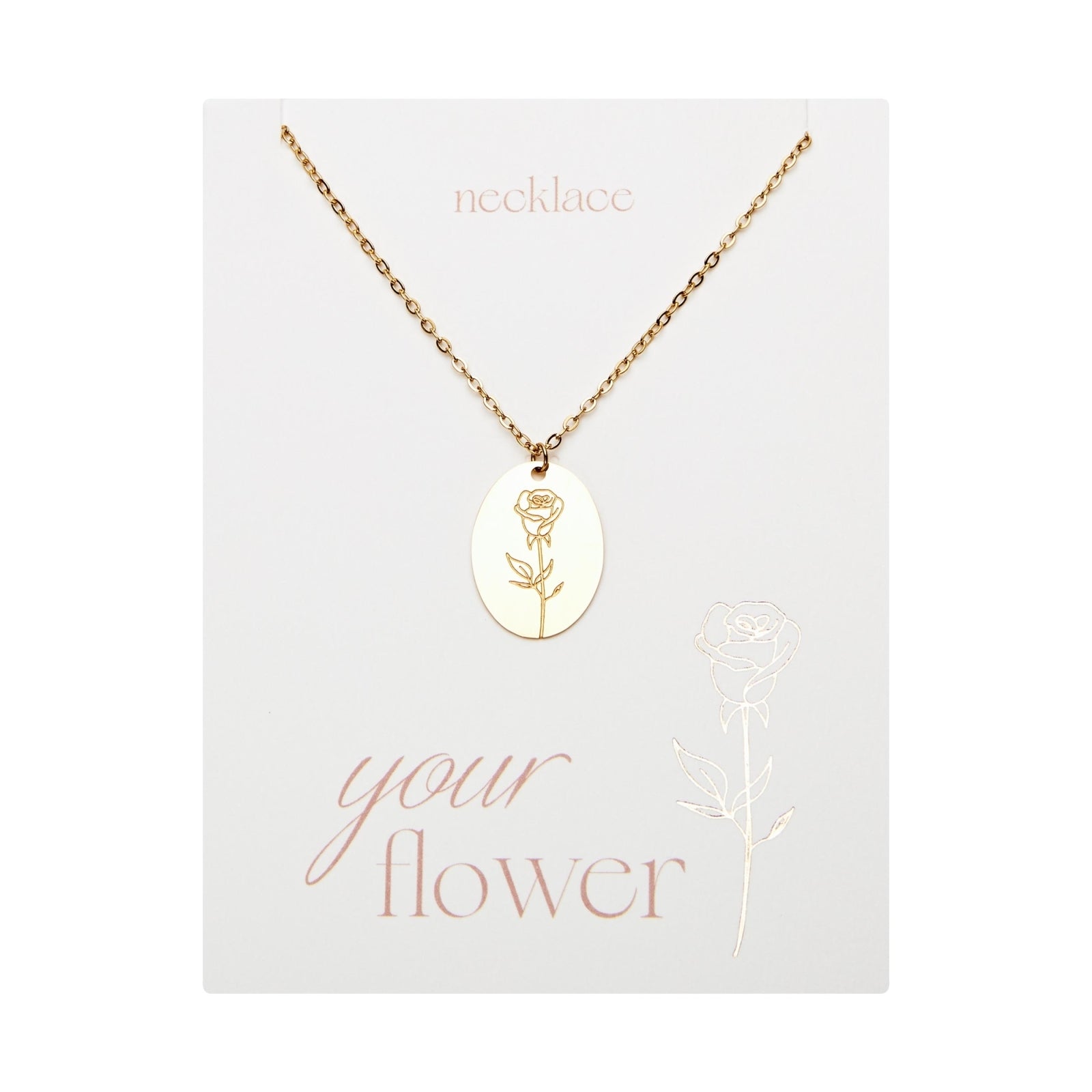 The Your Flower collection consists of necklaces and bracelets, each engraved with a birth flower. All jewelry is made of stainless steel, and six birth flowers are also gold plated. The name of the flower is engraved in English on the back of each necklace. Matching bracelets are available.