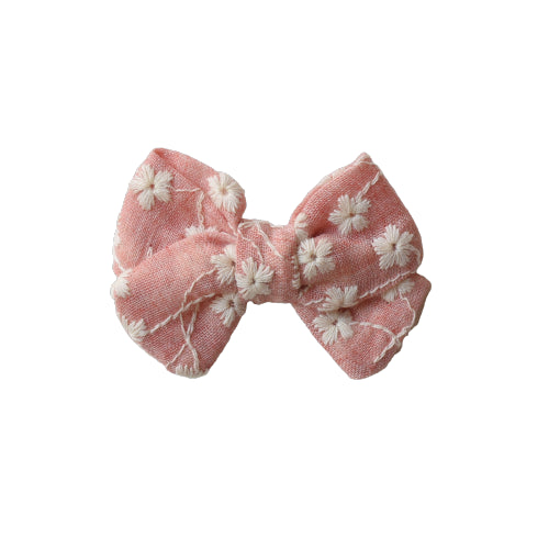 Small pink bow with embroidery - handmade cotton bow in latte color for children and women