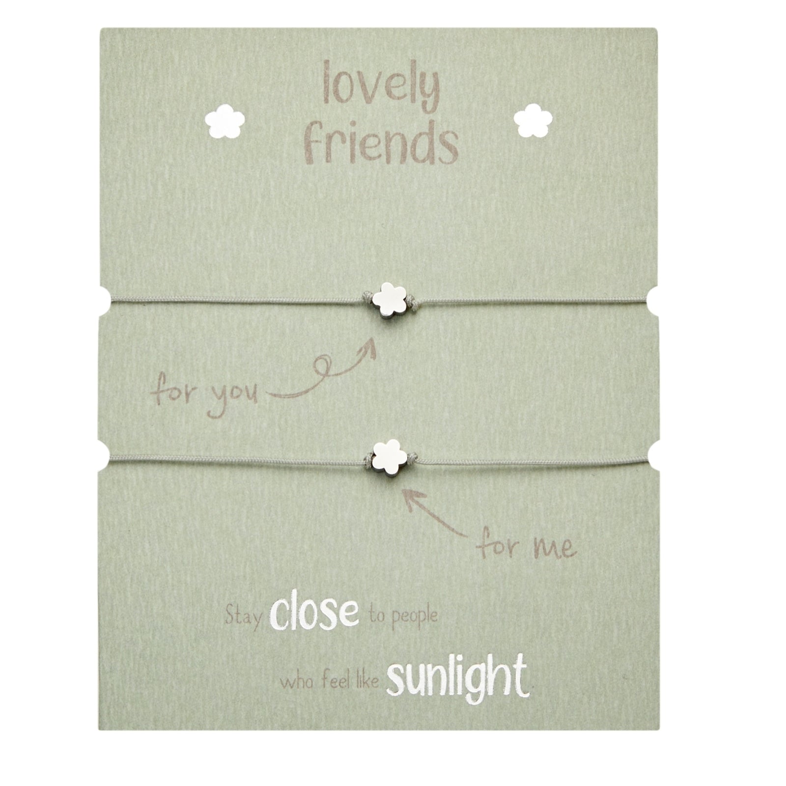 Piękny zestaw dwóch prostych bransoletek materiałowych z symbolem kwiatu, idealnych do dzielenia się z innymi lub do zachowania dla siebie. Bransoletkę można regulować, pociągając za końce.