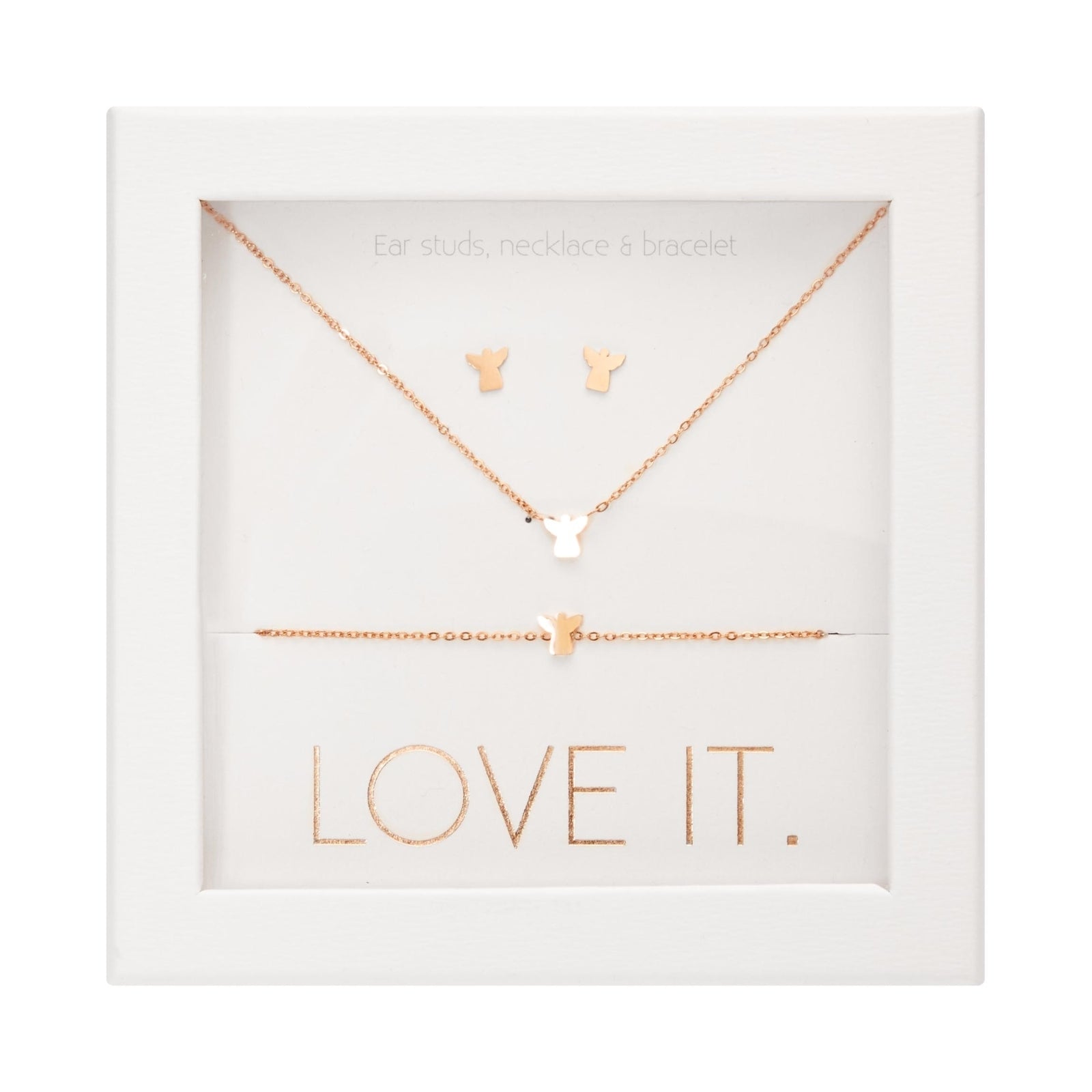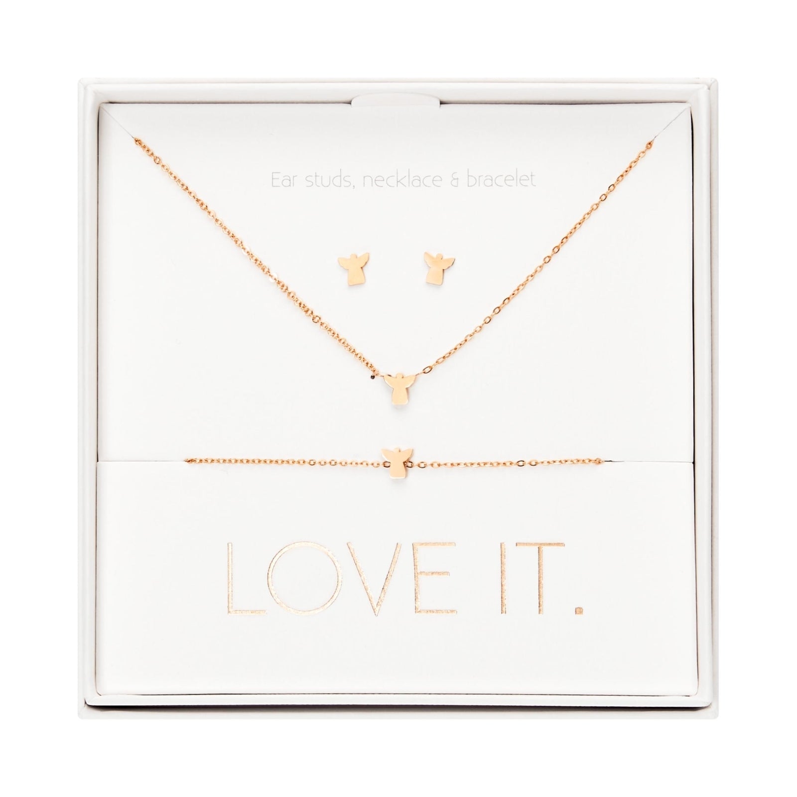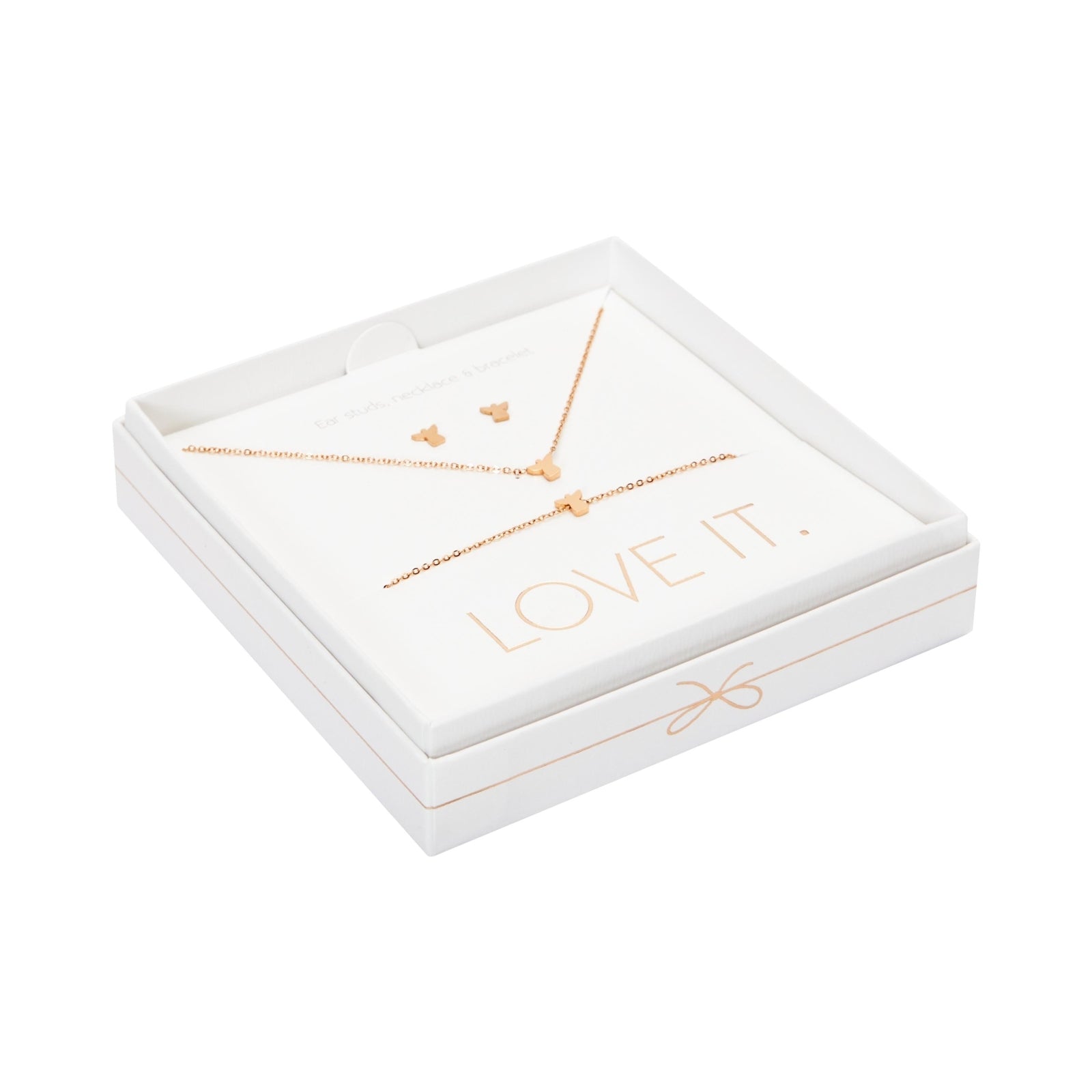 Wysokiej jakości zestaw prezentowy z kolekcji Love it., składający się z bransoletki, naszyjnika i kolczyków-wkrętów. Pięknie zapakowany w eleganckie kartonowe pudełko z okienkiem i błyszczącym stemplem z folii termotransferowej.