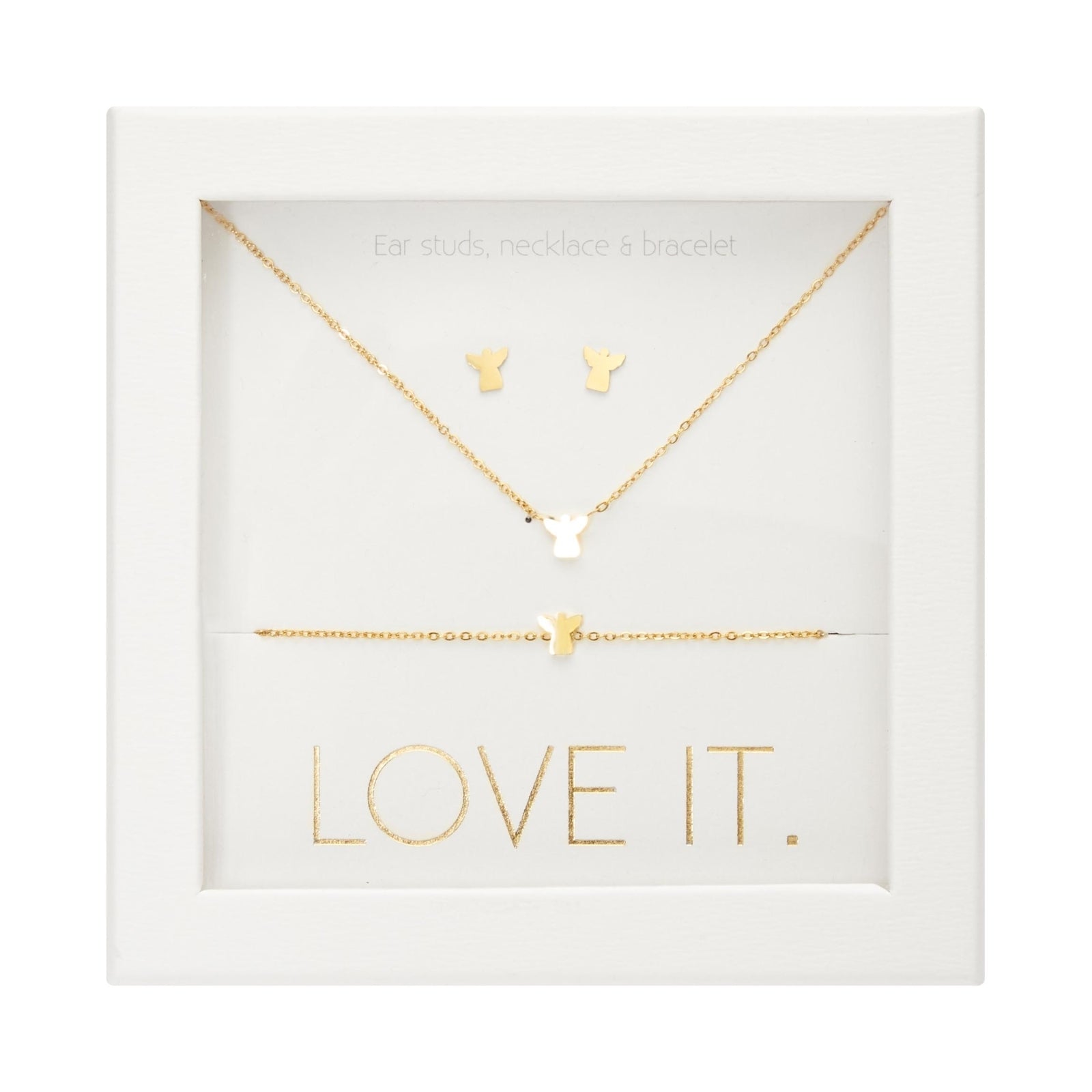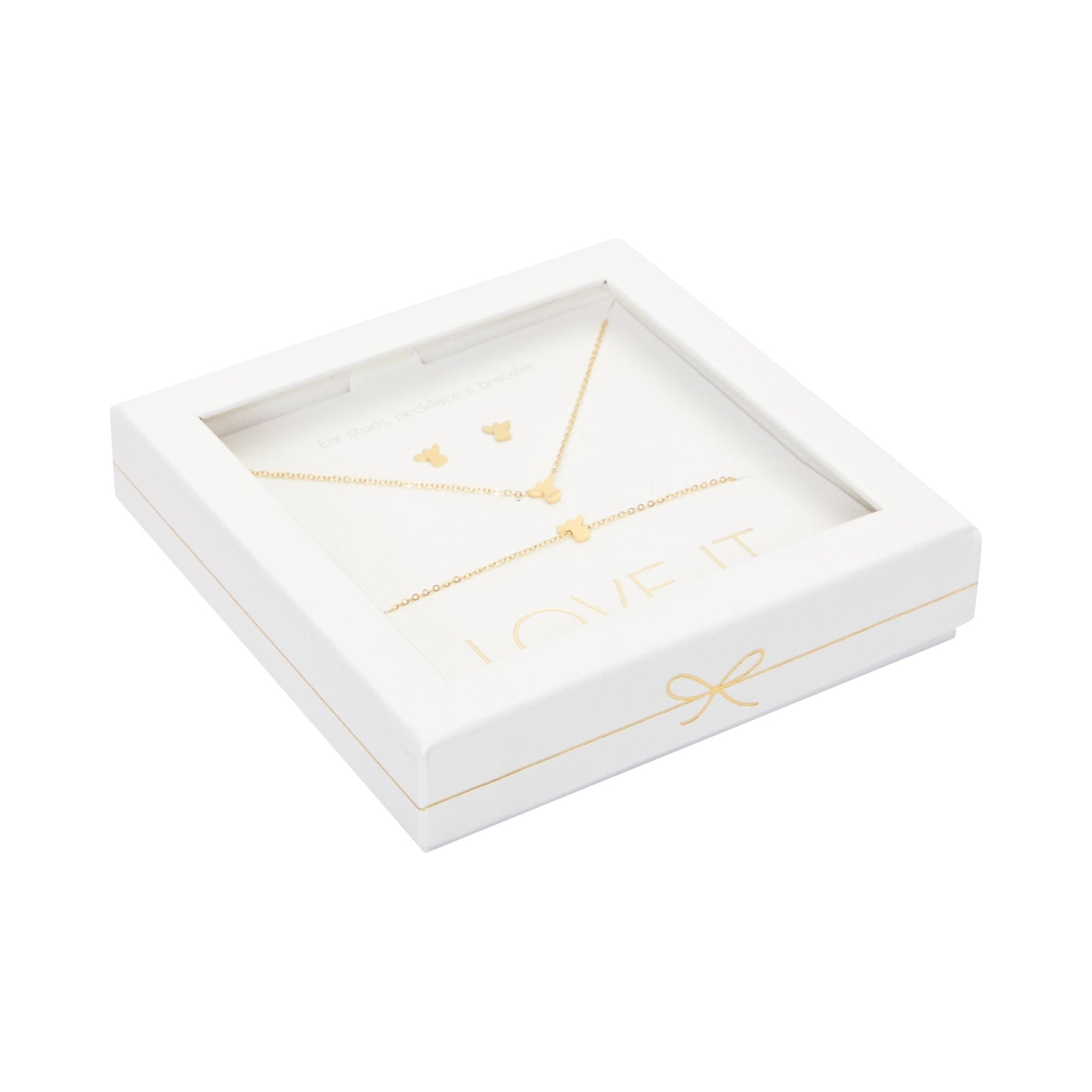 Wysokiej jakości zestaw prezentowy z kolekcji Love it., składający się z bransoletki, naszyjnika i kolczyków-wkrętów. Pięknie zapakowany w eleganckie kartonowe pudełko z okienkiem i błyszczącym stemplem z folii termotransferowej.