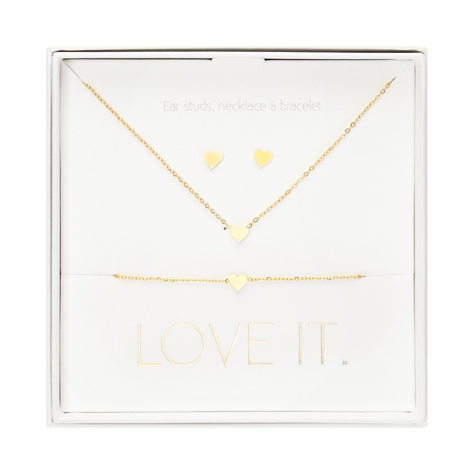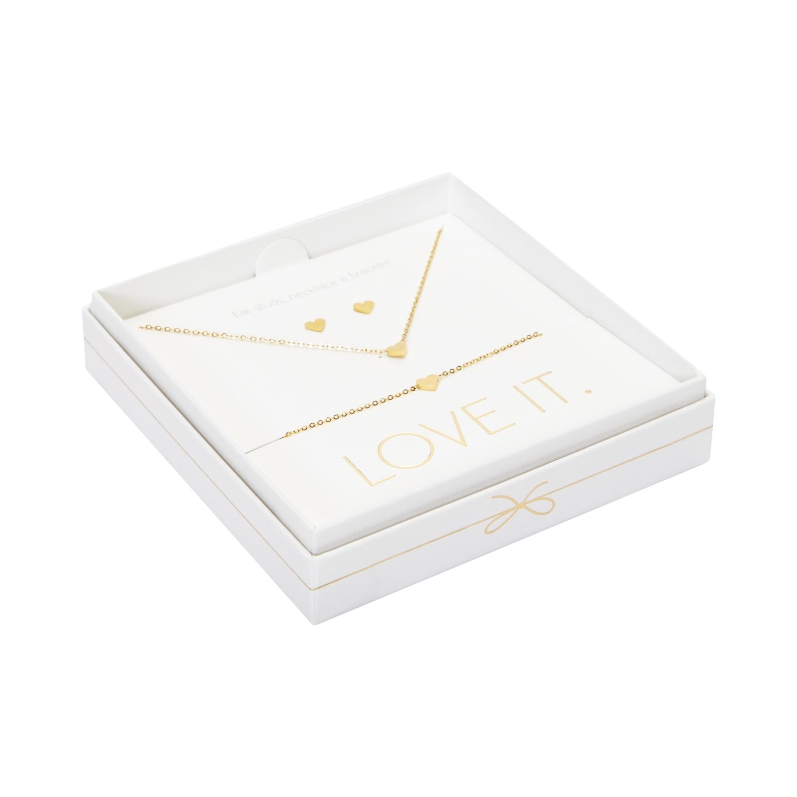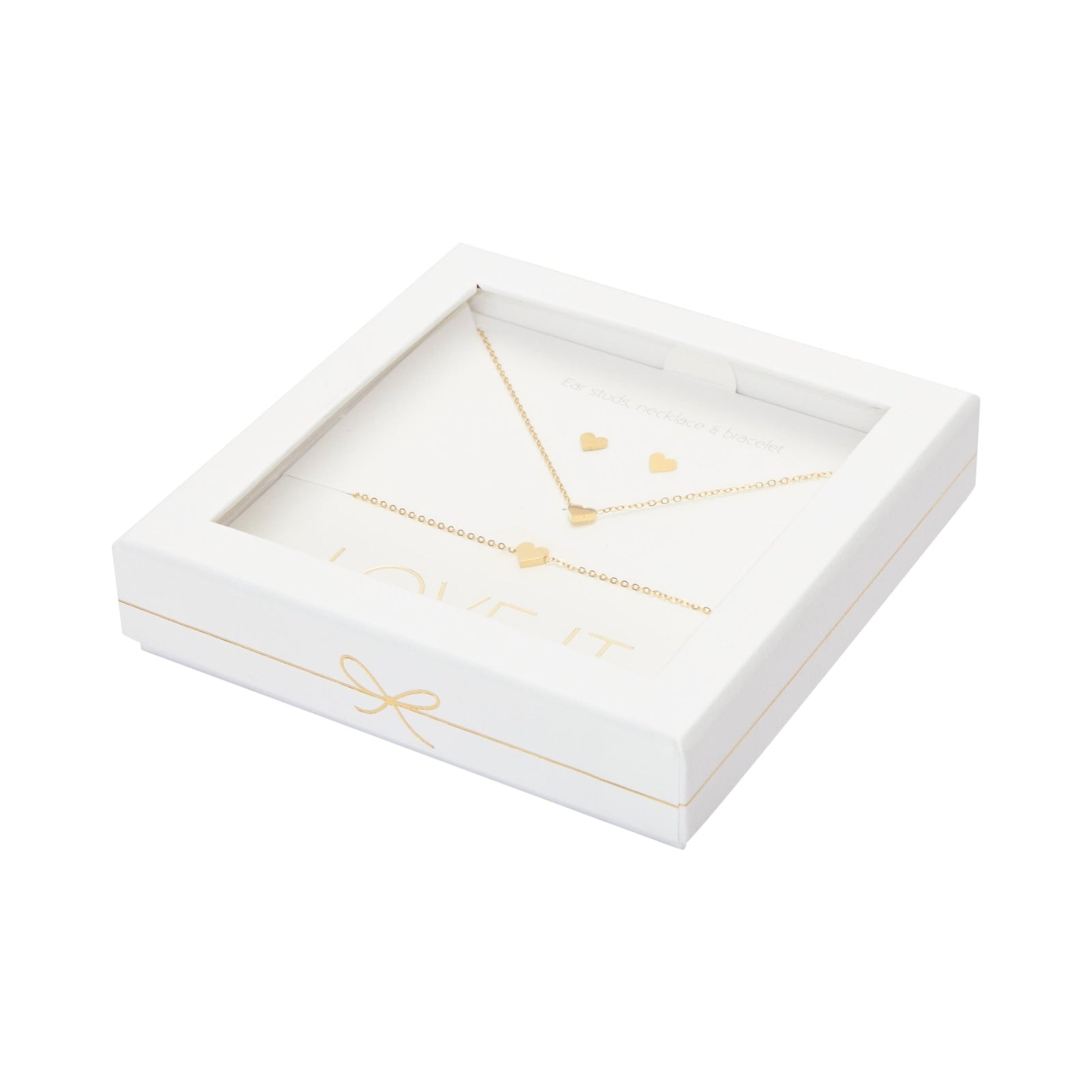 Wysokiej jakości zestaw prezentowy z kolekcji Love it., składający się z bransoletki, naszyjnika i kolczyków-wkrętów. Pięknie zapakowany w eleganckie kartonowe pudełko z okienkiem i błyszczącym stemplem z folii termotransferowej.
