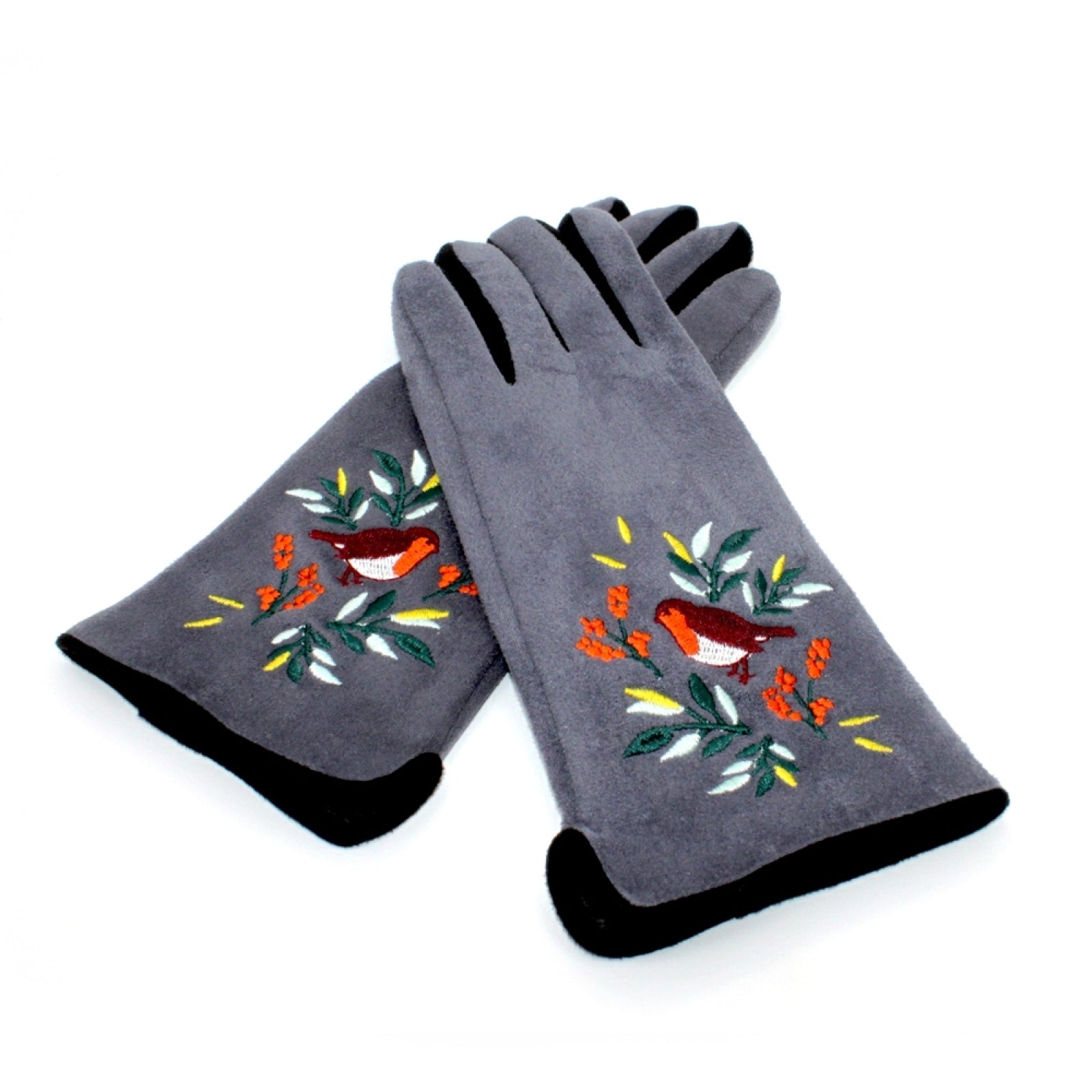 Te efektowne szare rękawiczki zdobi uroczy haftowany wzór z rudzikiem i listowiem. Są supermiękkie, a haft na palcu wskazującym umożliwia obsługę ekranów dotykowych. Idealne, wyraziste rękawiczki, które ogrzeją Twoje dłonie tej zimy!