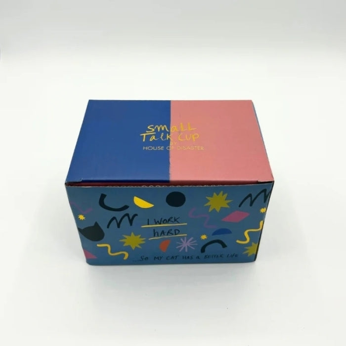 Materiały: Ceramika Cechy: Wstawaj i świeć, miłośnicy kofeiny! Poznajcie nowy kubek w mieście – kubek Small Talk „Cat”. Ten oryginalny kubek został wykonany ręcznie z efektem postarzenia – ta nietypowość jest częścią jego uroku! Kubek ma zabawny nadruk na całej powierzchni, trójwymiarową kocią mordkę i sekretną wiadomość w środku. Na tej małej karteczce widnieje: „Ciężko pracuję… żeby mój kot miał lepsze życie”… kto jeszcze się z tym utożsamia?