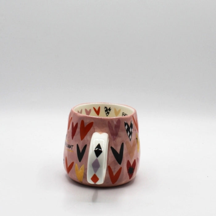 Cechy: Zażyj kofeinę w tym oryginalnym kubku! Ten słodziaczek ma postarzany, ręcznie robiony wygląd i może wyglądać nieco dziwnie… ale bez obaw, taki właśnie ma być! Kubek jest pokryty wzorem w serduszka, z trójwymiarowym sercem z przodu, a także zawiera sekretną wiadomość, która zaczyna się z przodu i kończy w środku! Ta mała notatka brzmi: „Mamo, jesteś genialna – genialnie przeklinasz”. To będzie wspaniały prezent dla mamy!