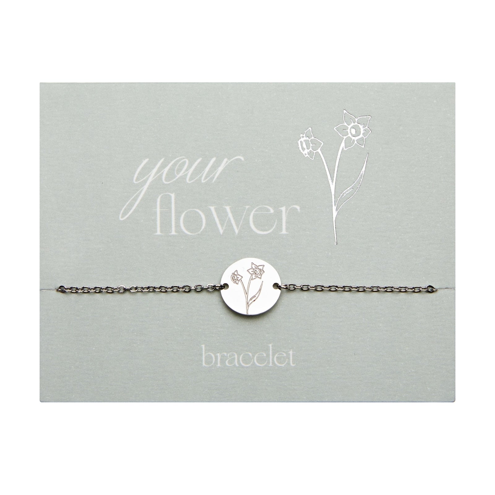 De collectie Your Flower bestaat uit kettingen en armbanden, elk gegraveerd met een geboortebloem. Alle sieraden zijn gemaakt van roestvrij staal en 6 geboortebloemen zijn ook verguld. De armbanden zijn aan beide zijden gegraveerd met de geboortebloem.