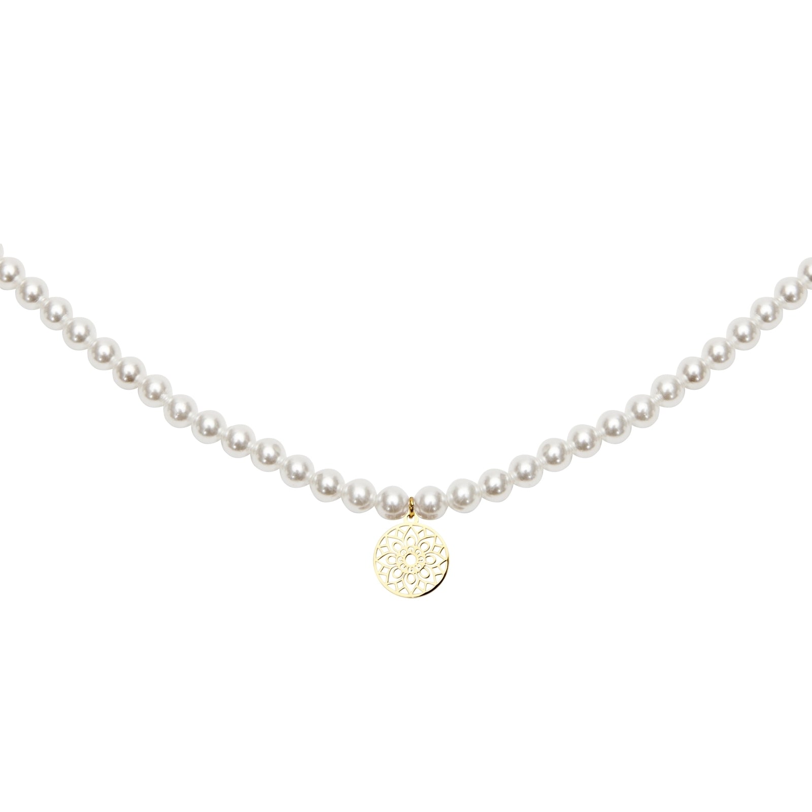 Prachtige ketting met parels en het mandala of luck symbool. De ketting heeft een verlengkettinkje van ca. 5 cm en is daardoor variabel in lengte.