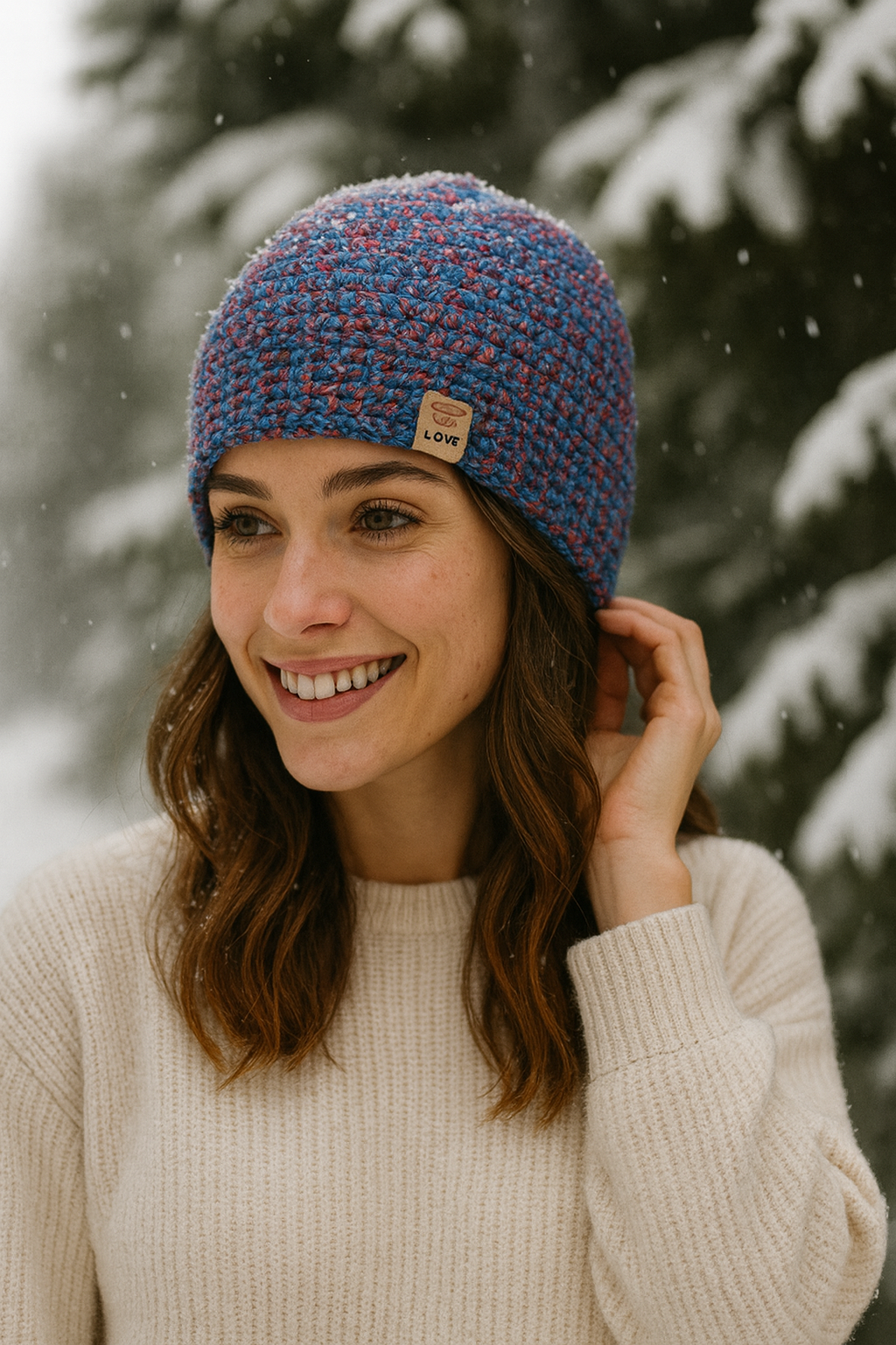 Blauw gemêleerde muts, 100% handgemaakt in Europa.