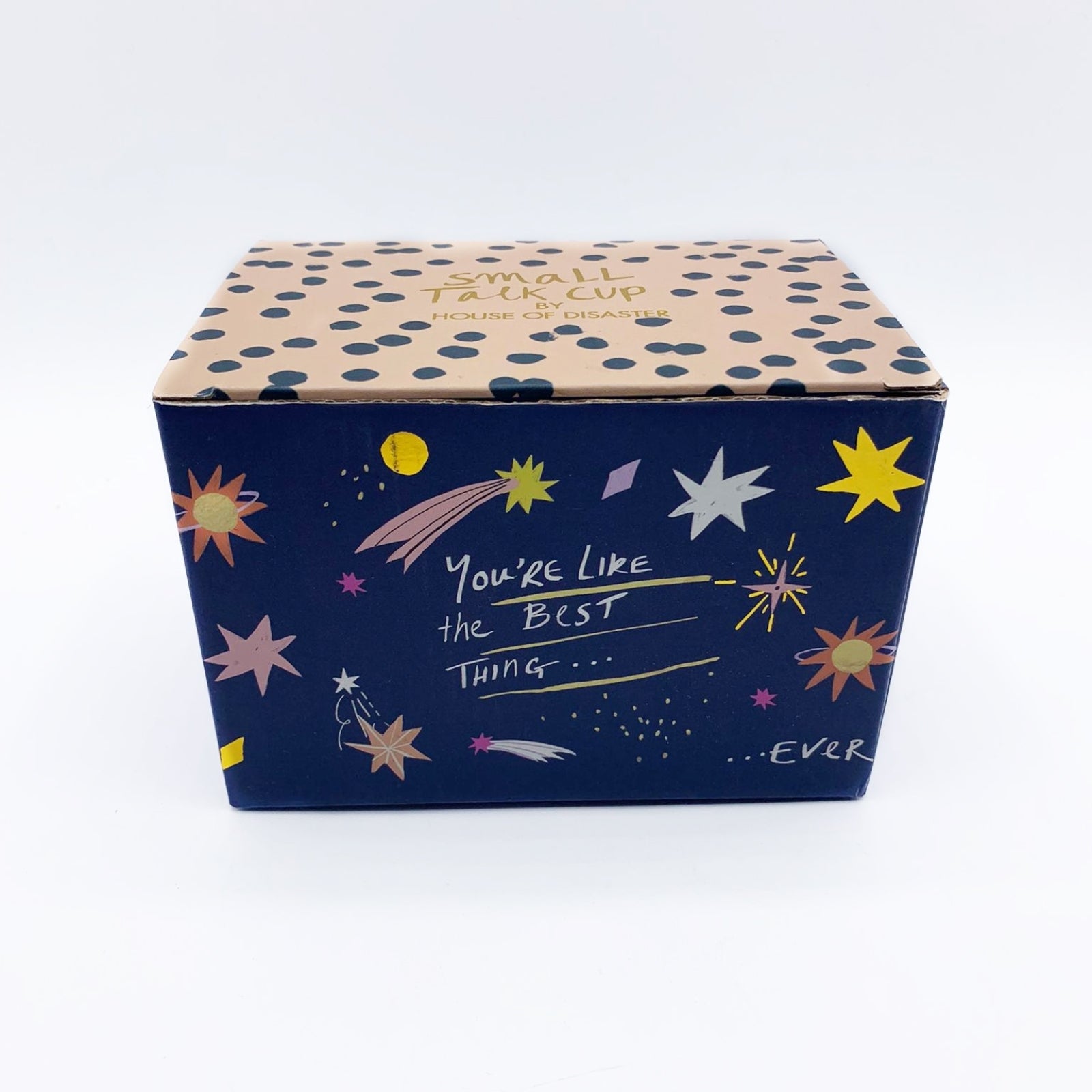 Kenmerken: Krijg je cafeïnefixatie in deze eigenzinnige kleine mok! Dit schatje heeft een gehavend, handgemaakt gevoel en ziet er misschien een beetje raar uit... maar maak je geen zorgen, dat hoort zo! Deze mok is helemaal bedekt met een prachtige hemelse print, met een 3D-ster op de voorkant en bevat ook een geheime boodschap die begint aan de voorkant en eindigt aan de binnenkant! Dit kleine memo luidt: "Je bent het beste... ooit". Het zou een mooi cadeau zijn voor een vriend met een goed gevoel voor humor.