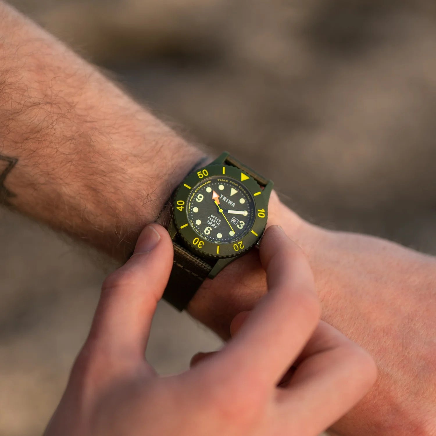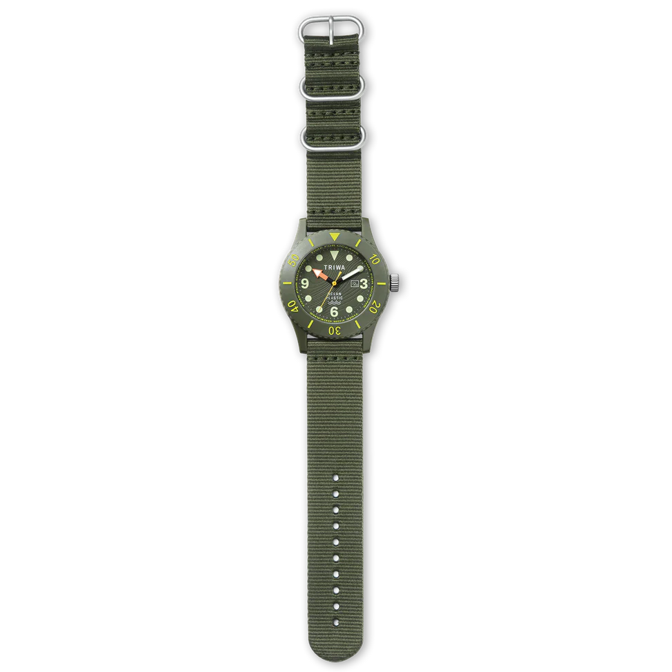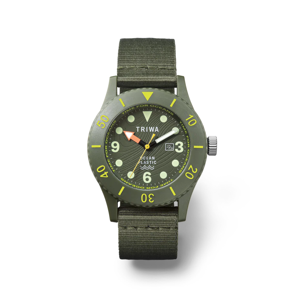 Met levendig groen, een wijzerplaat met 3D golfpatroon, lichtgevende indexen, draaibare lunette en 10 ATM waterbestendigheid is het gemaakt voor onderwateravonturen en alledaagse inspiratie. Slank, duurzaam en onmiskenbaar cool - het is een dagelijkse herinnering dat stijl en duurzaamheid hand in hand kunnen gaan. Oh, en het ziet er net zo goed uit met een wetsuit als met je weekendfit. Ga je gang, maak golven.
